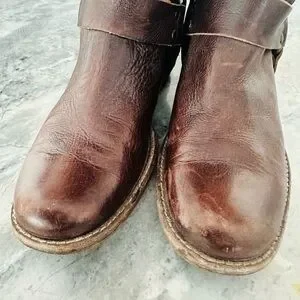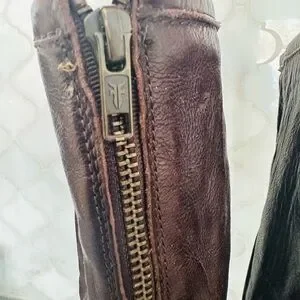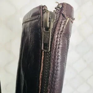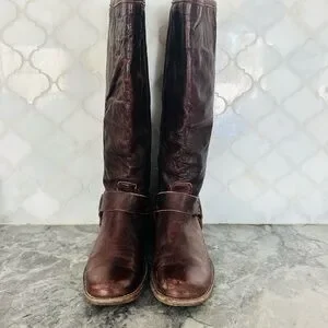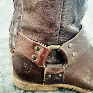 Elegant brown leather Frye harness boot in rich dark brown leather with buckle accents. Sturdy soles. Purchased new back in 2007 or so but been in my closet and never worn - the scuffs are original to the boot.