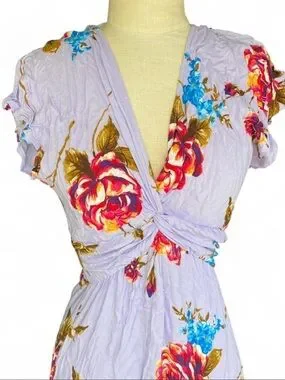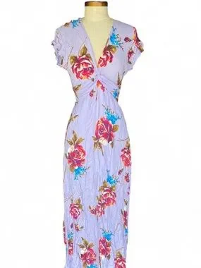 Soft lavender maxi dress with a bold rose floral print. Features a flattering V-neck and a gathered waist for a feminine silhouette. Lightweight and breezy for warm-weather wear. Lavender color adds a fresh, romantic touch.