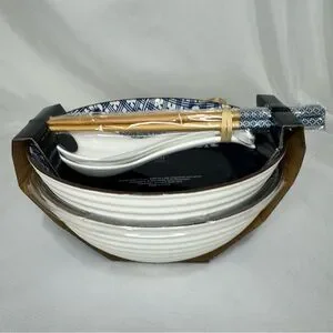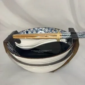SH Home Blue Cherry Blossom Noodle Bowl with Chopsticks & Spoons
