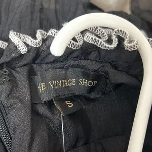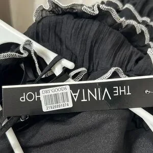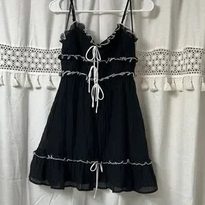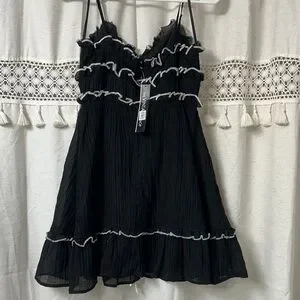 Flirty black mini with delicate ruffle trim. White tie-front accents add contrast. Lightweight, breezy skirt with feminine shape. Easy to dress up or down.