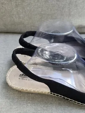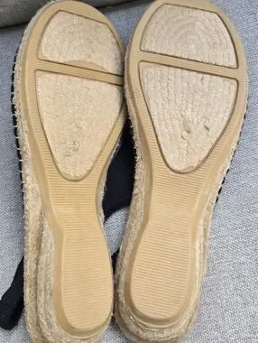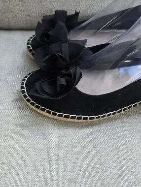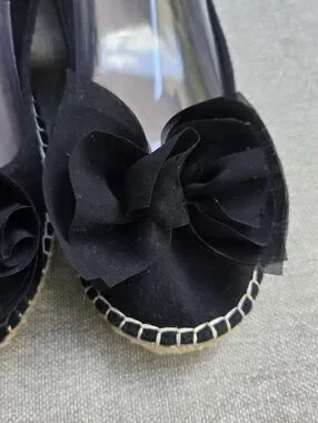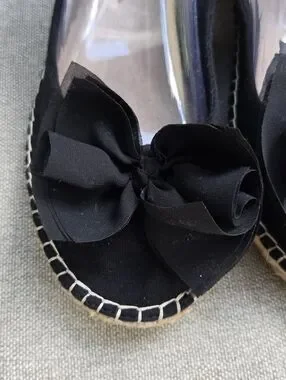 Classic black espadrille flats with a decorative bow. Lightweight and comfortable for everyday wear. Elastic slingback for a secure fit. Versatile black color pairs with many outfits.