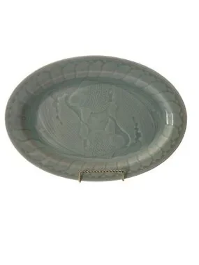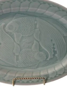 Longquan Celadon Koi Fish Platter 14 inch Green Glaze Mid-Century Abundance. This beautiful platter featuring a pale green glaze and twin molded Koi fish is in excellent condition. Chinese glazed ceramic is produced in the region of Zhejiang Providence and represents abundance and harmony. This mid-century platter is a great collector’s item.