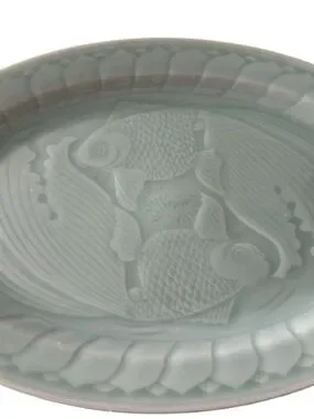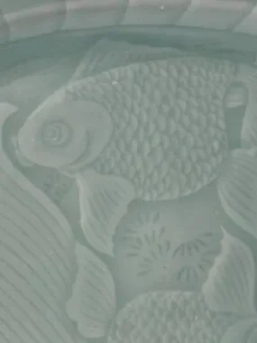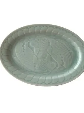 Longquan Celadon Koi Fish Platter 14 inch Green Glaze Mid-Century Abundance