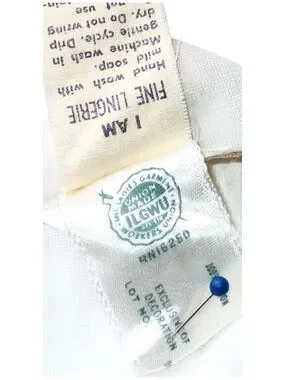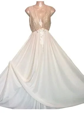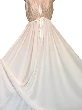 Vintage ivory lace nightgown with a romantic plunge bodice, soft lace detail, and a dramatic full sweep that gives it beautiful movement. This authentic vintage piece has a bridal boudoir feel with an ILGWU union made tag and a long, flowing silhouette that makes it especially striking.