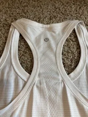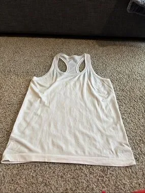 Breathable white racerback tank designed for everyday wear. Lightweight fabric offers comfortable stretch and easy movement. Clean, minimalist look perfect for layering or pairing with activewear. Machine washable for simple care.Tag removed.