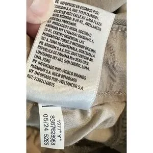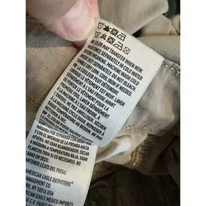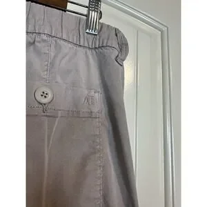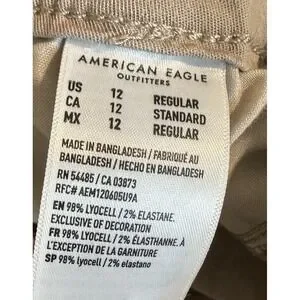 These American Eagle cargo pants for women in size 12 feature a mid rise with a wide leg fit, making them perfect for a relaxed and comfortable look. The beige color and solid pattern make them versatile for both travel and casual occasions. The pants have a zip and button closure, are machine washable, and made from a blend of spandex and lyocell for added stretch and comfort. With multiple pockets and a grunge, bohemian, and 90s theme, these cargo pants offer both style and functionality for a trendy and effortless outfit.
