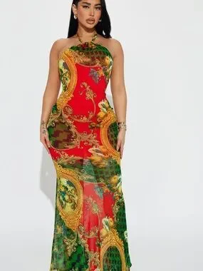 Fiona Mesh Halter Neck Red & Green Baroque Print Maxi Dress
