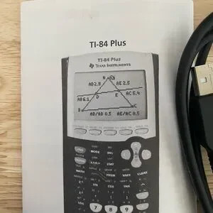 Texas Instruments TI-84 Plus calculator shown with USB cable and instruction manual. Sleek black casing and protective cover. Functional appearance for study or work tasks.