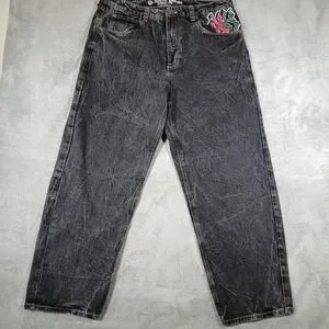Ninth Fall Ambush acid wash denim jeans feature a bold streetwear aesthetic with intricate embroidery throughout. These 100% cotton pants showcase a graffiti-style logo on the front pocket, while the back is detailed with a large 'Ninth Fall' script across the yoke and striking snake and eagle motifs on the rear pockets. The heavy acid wash finish provides a vintage, textured look, complemented by a classic five-pocket design and a relaxed straight-leg fit.