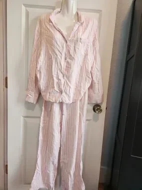 Soft striped sleep top with classic Victoria's Secret label. Light pink and white horizontal stripes. Comfortable everyday lounge piece.