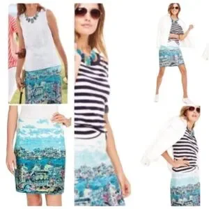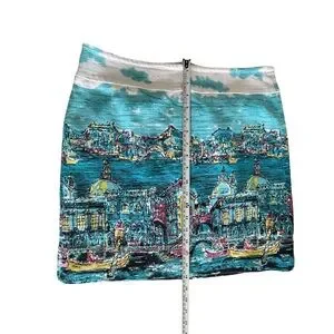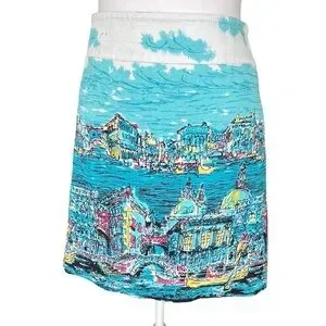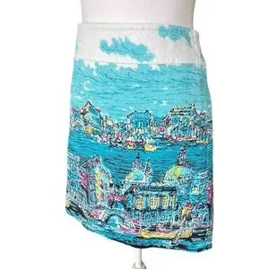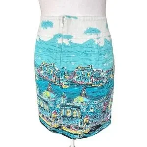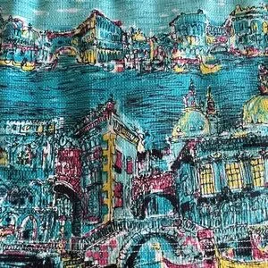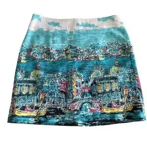 Charming Talbots skirt featuring a beautiful Venice-inspired cityscape print in vibrant shades of aqua, turquoise, pink, yellow, and white. This unique skirt has an artistic travel-print feel with gondolas, canals, and skyline details that make it a standout piece for spring and summer. A fun statement skirt that pairs perfectly with a simple white top, sandals, or wedges.