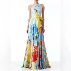 Designer One-Shoulder Maxi Dress – Abstract Print w/ Yellow Sash Alice + Olivia
