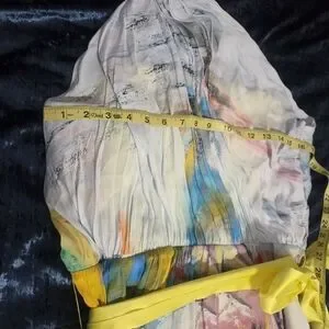 Step out in style with this elegant multicolor one-shoulder dress. Perfect for any occasion, this dress features a vibrant mix of colors and a flattering silhouette. The yellow belt adds a touch of sophistication.