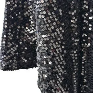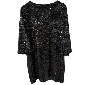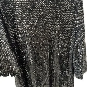 Elegant black dress with shimmering sequins. Ideal for special occasions. This sequined dress is a very nice evening party dress that can be worn for many different evening affairs. The dress is in very, very good condition. I have checked very carefully the sequins to make sure they are all intact and I see no flaws. There are many sequins and they appear to all be there. This dress shows very little wear and is very shimmery. The dress has nice bell sleeves and a rounded neckline. It is really pretty, a good brand and quality.