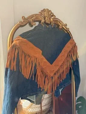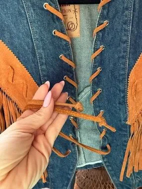 Vintage Frontier Denim Fringe Jacket in Brown Accent