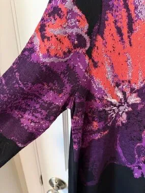 Elevate your everyday wardrobe with this stunning Chico's tunic sweater. Featuring a bold, artistic floral jacquard print in shades of purple and rust against a classic black background, this piece combines fashion with comfort. The 3/4-length sleeves with roll-cuff detailing and the flattering boat neckline make it a versatile choice for any season.