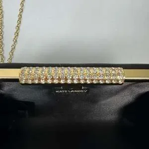 Kate Landry black satin evening clutch with rhinestone clasp and gold tone chain strap. This is a structured box clutch in excellent condition with no visible wear, stains, or damage. The satin finish is smooth and the rhinestone details on the clasp catch the light nicely.