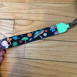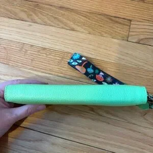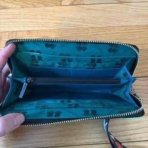 Min & Mon Francis green leather wallet with all over eyes embroidery. Genuine leather bright green zip around wallet with eye embroidery detail. Eight card slots at interior. One interior zipper pocket. Removable nylon wrist strap. 7 3/4"W x 4"H x 1"D. In great condition.