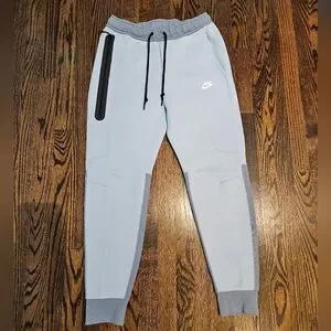 Nike track joggers in a pale blue shade. Elastic waistband with adjustable drawcord. Black zip pocket and black drawstrings. Ribbed cuffs and subtle logo at front. Comfortable, sporty silhouette for everyday wear. Size Medium. Never worn.