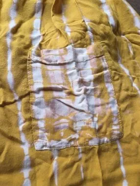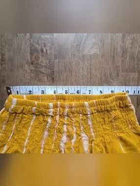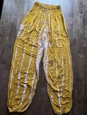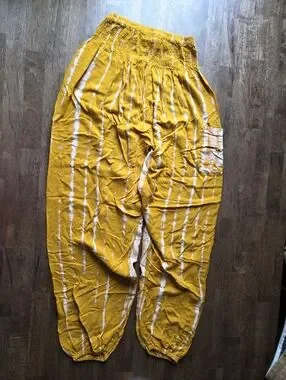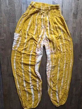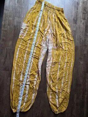Flowy harem pants with elastic waist and ankle cuffs. Soft tie-dye stripes in white on a mustard yellow base. Lightweight and relaxed fit. Easy to style for casual wear. 100% Rayon handmade in Indonesia. Waist stretches comfortably to approximately 15"