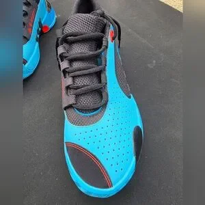 Bold blue sneaker with black mesh and red accent details. Modern athletic silhouette.