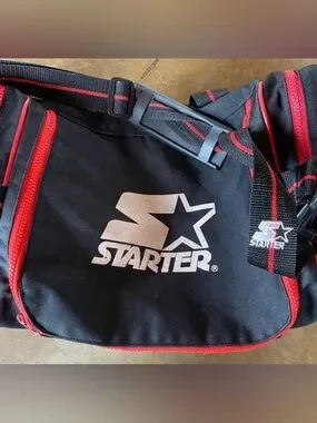 Vintage 90s Starter Ottawa Senators duffel bag in black and red. Rare NHL hockey piece with classic large team logo and bold Starter branding. Great size for gym, travel, or everyday use. Strong zippers, multiple compartments, and durable straps. Sick little details with embroidered starter logo on strap and little starter pendant on zip. Clean overall condition with normal wear from age. Hard to find in this style and colorway.