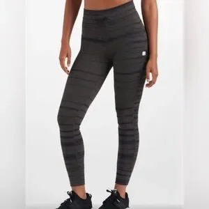 Sleek Vuori leggings with black and gray stripes. Ideal for workouts or casual wear. Comfortable and stylish.
