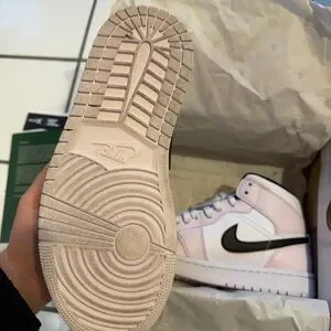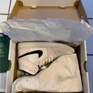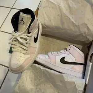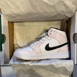 Air Jordan 1 Mid in soft pink and white leather. Contrasting black Swoosh and collar trim. Lace-up design with padded ankle support. Clean, sporty look for everyday wear.