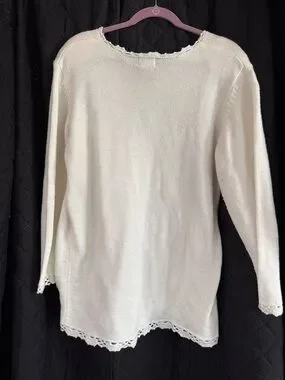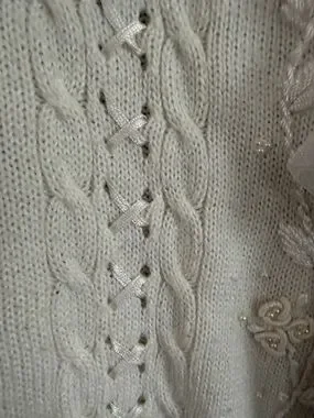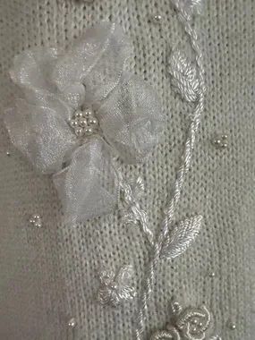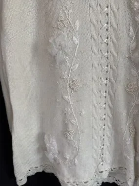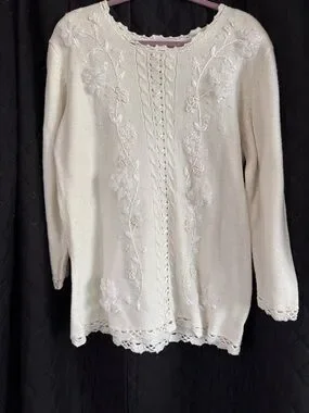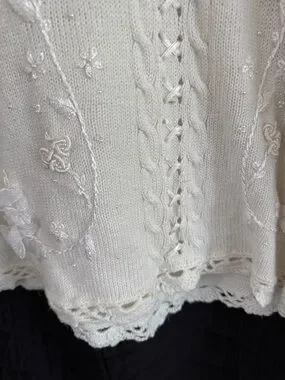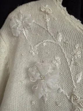 Vintage 80s/90s Koret Ivory Sweater 3D Floral Pearl Bead Embroidery Sz M