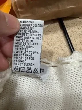A showstopping piece of authentic late 1980s–early 1990s vintage fashion — this Koret ivory pullover sweater is a true cottagecore and grandmacore collector’s dream. The level of hand-applied ornamentation on this sweater is extraordinary: 3D organza ribbon flowers with pearl bead centers, delicate satin ribbon threaded through cable knit panels, intricate chain-stitch floral vine embroidery, and a scalloped crochet hem and cuffs. The back is a beautifully clean plain knit, making the ornate front even more dramatic.