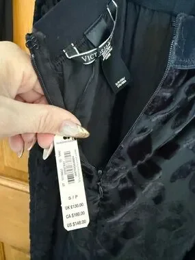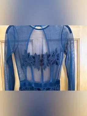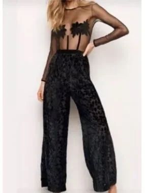 Fitted sheer mesh bodice with long sleeves. Floral appliqué accents across the chest. High waist leads to wide-leg velvet burnout pants. Sleek black design for evening wear. NWT