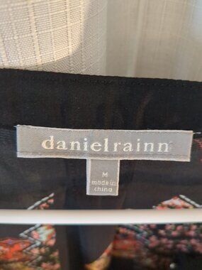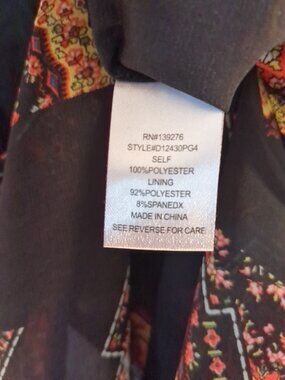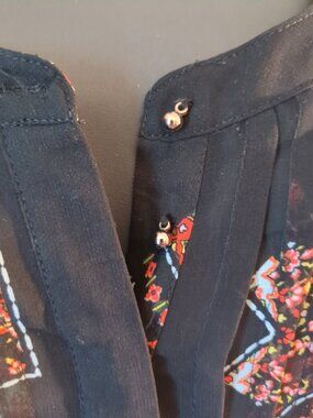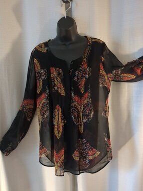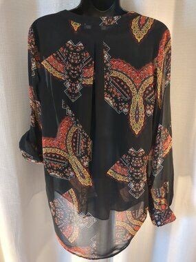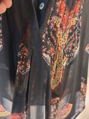 Sheer black partial button front. Button long sleeves or cuff sleeves. Multi color design on sheer black fabric.