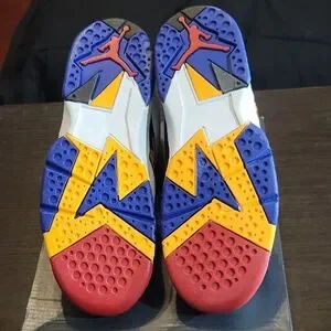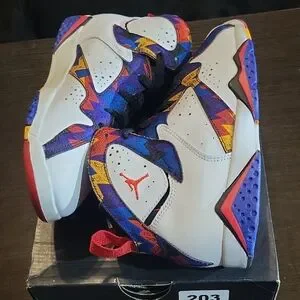 The Extremely Rare Nike Air Jordan 7 Retro "Nothing But Net" (also widely known as the "Sweater" colorway) was officially released on November 14, 2015. The sneaker features a distinctive multi-colored geometric pattern on a white leather base. This design is directly inspired by a bold printed sweater and shorts combo worn by Michael Jordan in two iconic early '90s moments. It is very rare to find this shoe used or new but this pair is brand new deadstock in excellent wearable condition with no flaws. This pair would make a great addition to a collectors collection. Boys size 3Y Girls size 4.5.