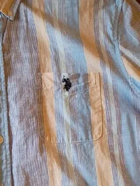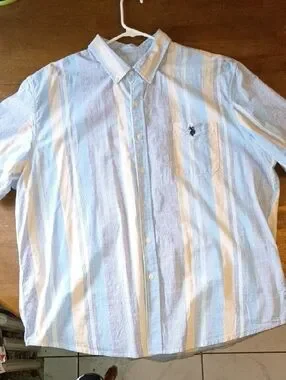 Classic short sleeve button-up shirt in light blue and white vertical stripes. Lightweight, breathable fabric for everyday comfort. Clean collar and chest pocket for a polished casual look. Easy to pair with jeans or chinos for versatile wear.