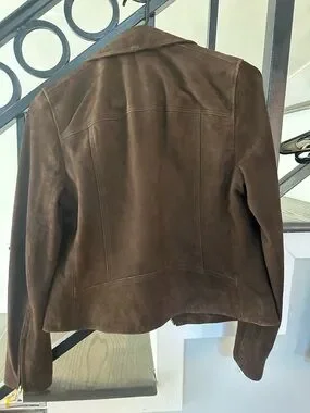 Rich brown suede moto jacket. Asymmetrical zip front and zippered pockets. Sleek, versatile layering piece. Classic motorcycle silhouette. NWOT. Never worn. Perfect condition.