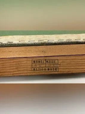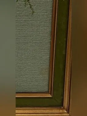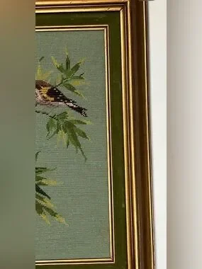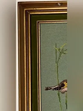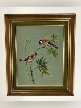 This vintage 1997 petit point needlepoint features a delicate oriental-inspired design of two European Goldfinches perched on a bamboo branch. Hand-stitched with fine detail, the artwork is presented in a classic gold-toned wooden frame that measures 19”x16”. A lush, deep-green velvet inner mat surrounds the needlework, providing a rich textural contrast to the intricate stitching. Labeled "Made in Mexico," this open-faced piece is displayed without glass, allowing the tactile quality and vibrant colors of the embroidery to be fully appreciated.