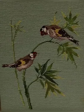Vintage Framed Petit Point Needlework – Two Birds on Bamboo ,Made in Mexico 1997