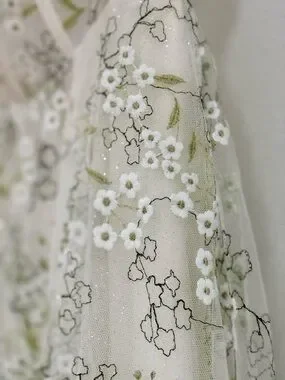 Soft ivory base with delicate sage green floral embroidery and a subtle shimmer layer underneath that catches the light beautifully.