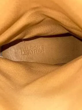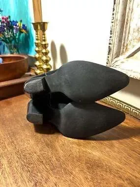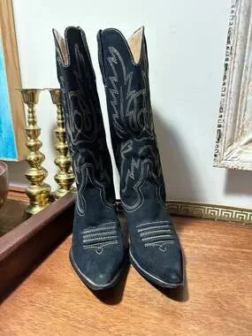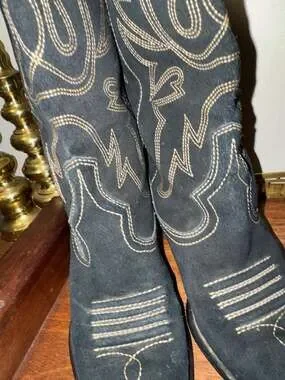 Wilsons Leather black suede tall western cowboy boots with contrast stitching. Classic western style with that traditional cowboy boot look. The black suede has a nice texture and the contrast stitching adds detail to the boots. Authentic Wilsons Leather cowboy western boots. Preloved condition with some wear on heels as shown in photos. Was worn with an insole so inside footbed is perfect.