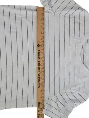 Casual short-sleeve crewneck tee with thin black stripes on a white base. Soft, breathable fabric for everyday comfort. Relaxed fit with a curved hem for easy layering. Classic striped design adds understated style.