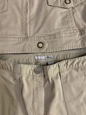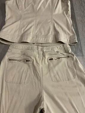 Chico's matching set. Sleeveless utility vest with a front zip, button-flap pockets and metal grommet details. Matching chino pants with same zipper and grommet details. Lightweight, neutral beige tone for casual chic look. Excellent condition. No holes, stains, pilling, or signs of wear. Price is for both pieces.