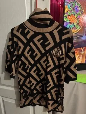 Fendi Black & Tan FF Logo Turtleneck Short Sleeve Knit