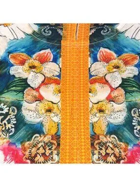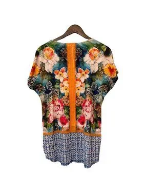 Floral Print Multicolor High-Low Blouse With Orange Accents Size L Tropical