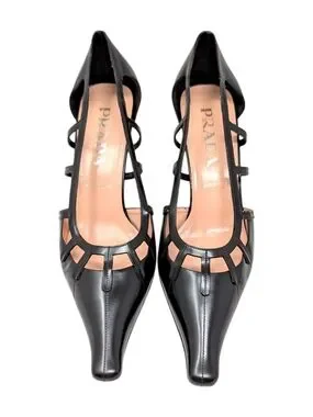 Prada Vintage Heels, Prada Kitten Heels, Cage Cut Out Shoes, Prada Lattice Pumps, Pointed Toe Stilettos, Miuccia Prada, Y2K Prada Footwear, Black Leather Heels, Architectural Designer Shoes, Prada 90s Vintage, Made in Italy, CBK Prada 1990's / 2000's