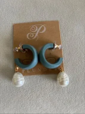 Plunder Teal Crescent Hoop Earrings with Pearl Drops