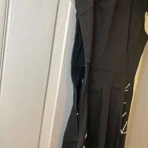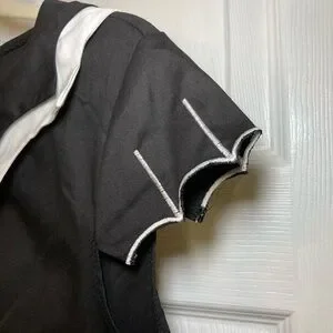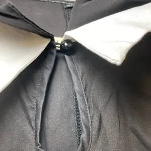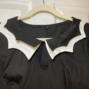 Super cute black and white dress for Halloween season or throughout the year. The shape is very flattering for a curvy figure. There is a double layer collar in a spiderweb shape with a button keyhole. The cap sleeves have embroidered accents of spiderweb. The skirt has spiderwebs and bats embroidered on both sides. Side zipper.
