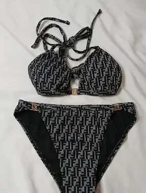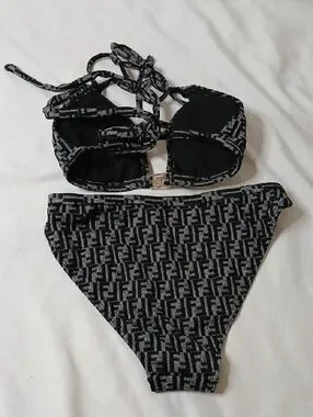 Fendi Black & Gray Logo Print Bikini Set