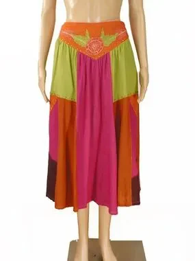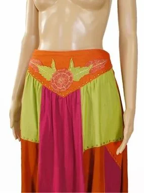 Vintage 80s Western Patchwork Orange Pink Green Colourblock Studded Long Skirt