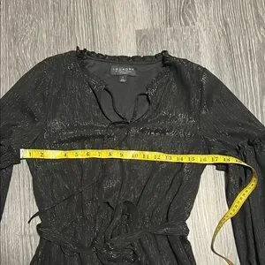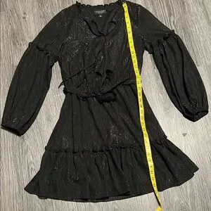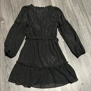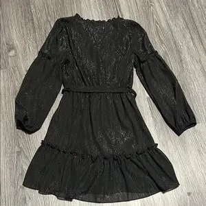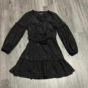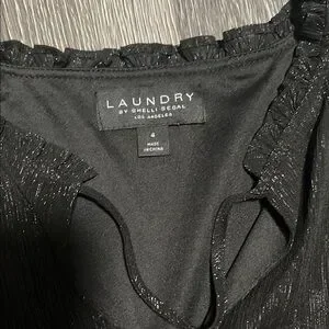 Elevate your evening look with this chic black mini dress from Laundry By Shelli Segal, perfect for a cocktail night out. Featuring a sophisticated V-neckline and elegant bishop sleeves, this dress offers a flattering cinched waist and a flared A-line silhouette. The textured fabric adds a subtle sparkle, enhancing its glamorous appeal.