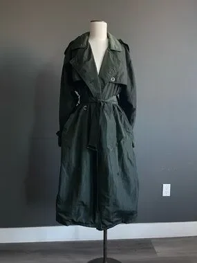 A study in restraint and texture, this deep olive trench coat moves with a soft, almost weightless structure—capturing the quiet sophistication of The Row and the effortless tailoring of Toteme. The fabric has a subtle sheen and natural crinkle, echoing the lived-in refinement often seen in Brunello Cucinelli and the understated utility of Ralph Lauren outerwear.